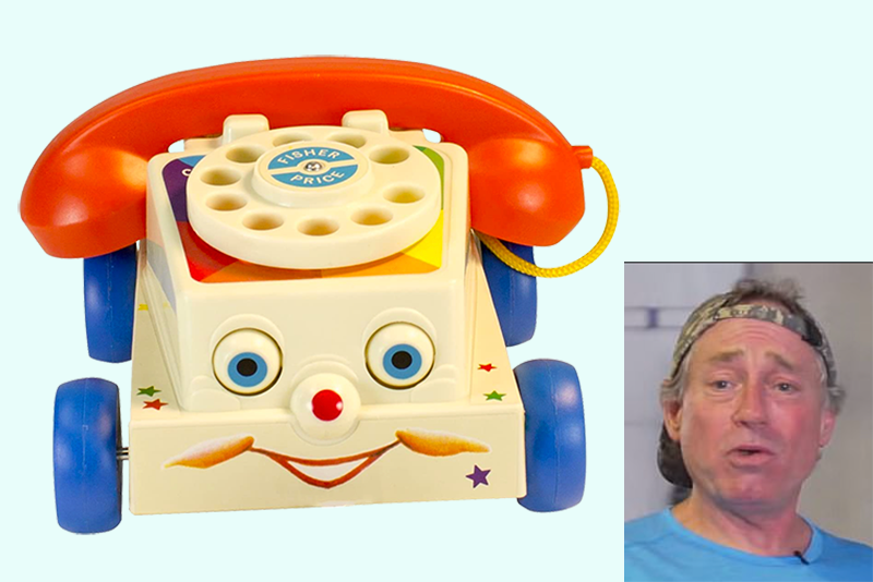 The new company-supplied phone, a model by Fisher Price, features a ringing rotary dial, eyes that roll up and down, and sturdy construction. It also has wheels and a long string attached to the front of its base, making it highly portable.